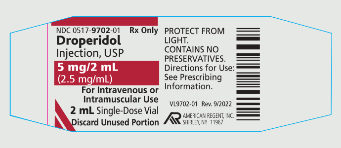 There are no adequate and well-controlled studies in pregnant women. Droperidol should be used during pregnancy only if the potential benefit justifies the potential risk to the fetus. Labor and Delivery: There are insufficient data to support the use of droperidol in labor and delivery. Nursing Mothers: It is not known whether droperidol is excreted in human milk. Because many drugs are excreted in human milk, caution should be exercised when droperidol is administered to a nursing mother. Pediatric Use: The safety of droperidol in children younger than 2 years of age has not been established. ADVERSE REACTIONS QT interval prolongation, torsade de pointes, cardiac arrest, and ventricular tachycardia have been reported in patients treated with droperidol. Some of these cases were associated with death. Some cases occurred in patients with no known risk factors, and some were associated with droperidol doses at or below recommended doses. Physicians should be alert to palpitations, syncope, or other symptoms suggestive of episodes of irregular cardiac rhythm in patients taking droperidol and promptly evaluate such cases. The most common somatic adverse reactions reported to occur with droperidol are mild to moderate hypotension and tachycardia. If hypotension occurs and is severe or persists, the possibility of hypovolemia should be considered and managed with appropriate parenteral fluid therapy. The most common behavioral adverse effects of droperidol include dysphoria, postoperative drowsiness, restlessness, hyperactivity and anxiety, which can either be the result of an inadequate dosage or of an adverse drug reaction. Postoperative hallucinatory episodes (sometimes associated with transient periods of mental depression) have also been reported. Other less common reported adverse reactions include anaphylaxis, dizziness, chills and/or shivering, laryngospasm and bronchospasm. Elevated blood pressure, with or without pre-existing hypertension, has been reported following administration of droperidol combined with fentanyl citrate or other parenteral analgesics. OVERDOSAGE Manifestations: The manifestations of droperidol overdosage are an extension of its pharmacologic actions and may include QT prolongation and serious arrhythmias. Treatment: In the presence of hypoventilation or apnea, oxygen should be administered and respiration should be assisted or controlled as indicated. A patent airway must be maintained. The patient should be carefully observed for 24 hours; body warmth and adequate fluid intake should be maintained. If hypotension occurs and is severe or persists, the possibility of hypovolemia should be considered and managed with appropriate parenteral fluid therapy. If significant extrapyramidal reactions occur in the context of an overdose, an anticholinergic should be administered. For additional Safety Information, including BOXED WARNING, please see Full Prescribing Information. You are encouraged to report Adverse Drug Events (ADEs) to American Regent Inc. at 1-800-734-9236 or to the FDA by visiting www.fda.gov/MedWatch or calling 1-800-FDA-1088.